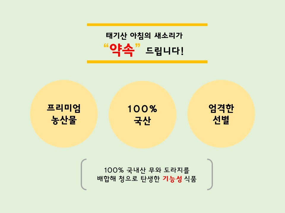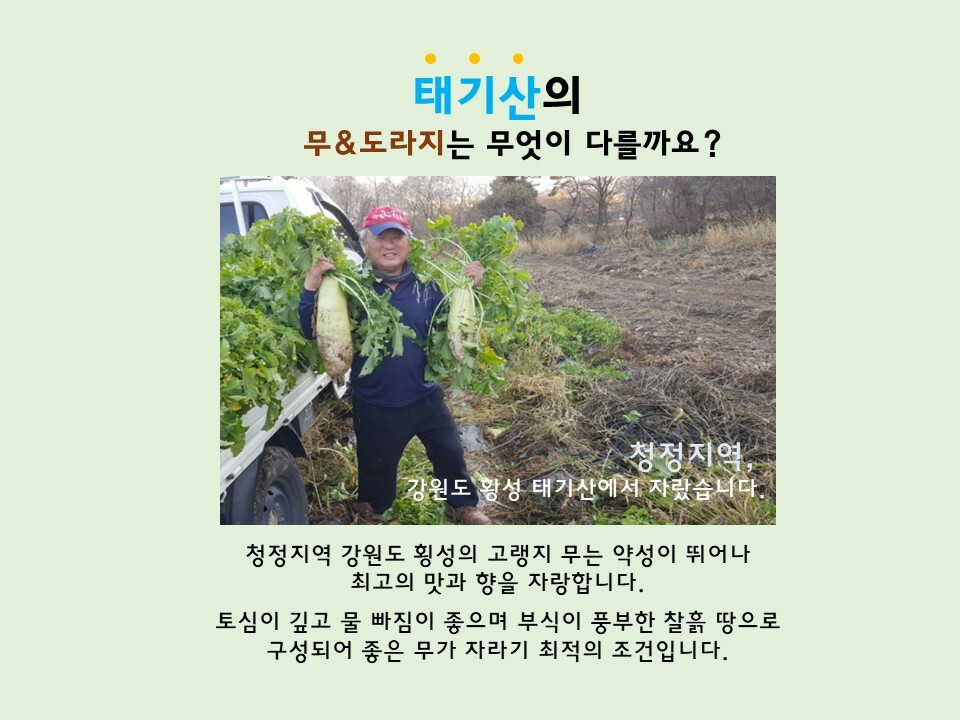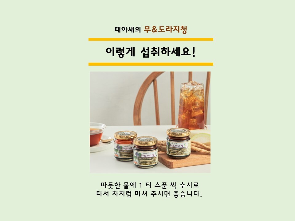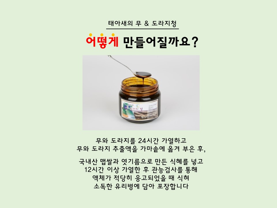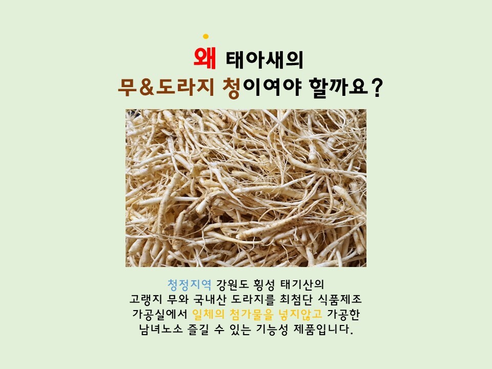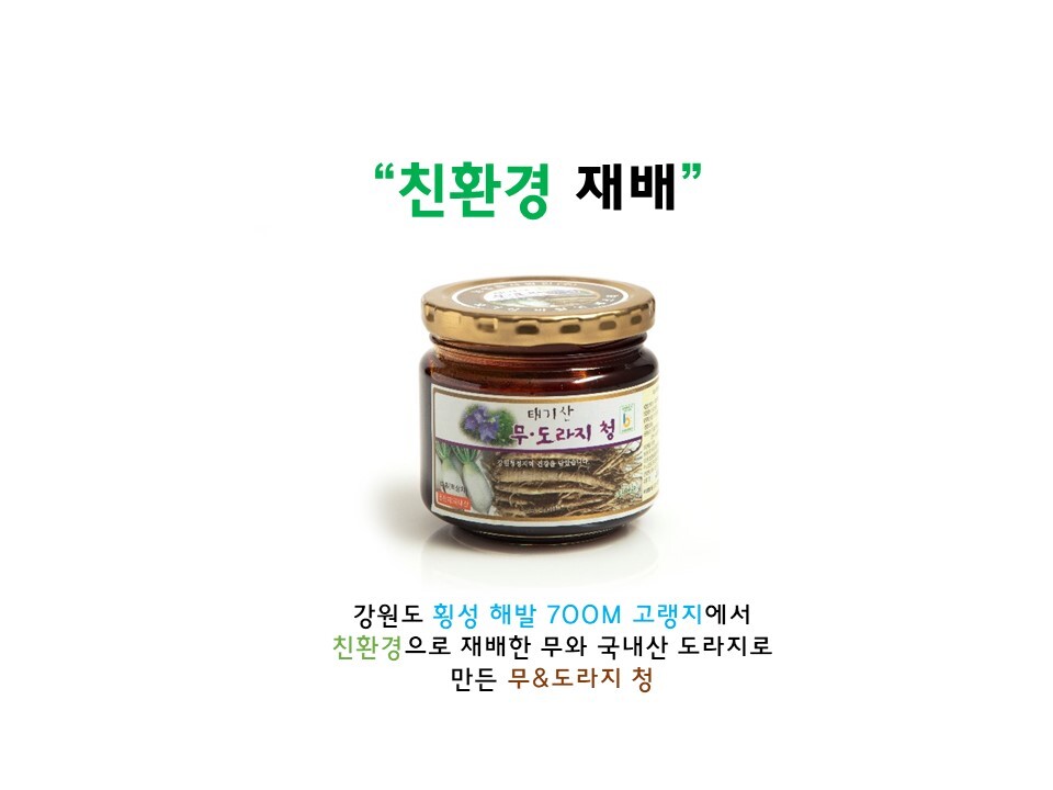 - 청정지역 가원도 횡성(태기산) 해발700m고랭지 무와 국내선 도라지를 최첨단 시설을 갖춘 식품가공실에서 청으로 가공하여 유통. 판매 합니다. 설탕 등 일제의 첨가물을 넣지 않고 가공하여 담백한 맛이 좋아 남녀노소 누구나 먹을 수 있는 안전한 기능서 식품입니다
