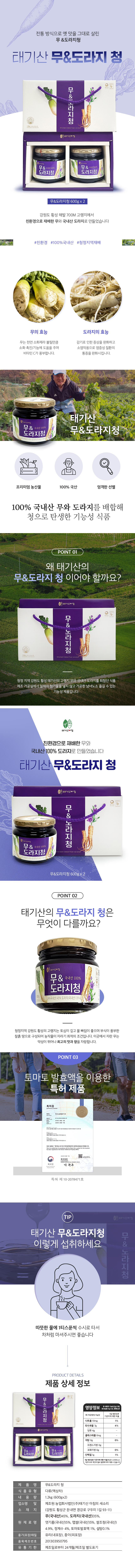 - 청정지역 가원도 횡성(태기산) 해발700m고랭지 무와 국내선 도라지를 최첨단 시설을 갖춘 식품가공실에서 청으로 가공하여 유통. 판매 합니다. 설탕 등 일제의 첨가물을 넣지 않고 가공하여 담백한 맛이 좋아 남녀노소 누구나 먹을 수 있는 안전한 기능서 식품입니다